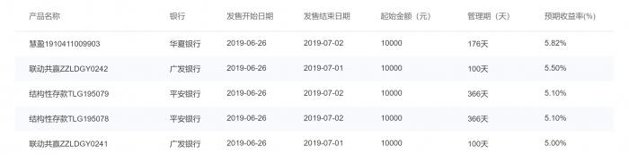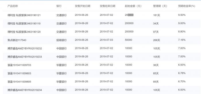 6月28日当日,在售产品当中,交通银行的得利宝·私银慧享2463190121的预期收益率最高,为9.5%,投资门槛达到20万元,管理期限也较长为181天。此外根据融360统计,除了交通银行之外,招商银行、中国银行、华夏银行、广发银行、平安银行也有产品的收益超过5%。