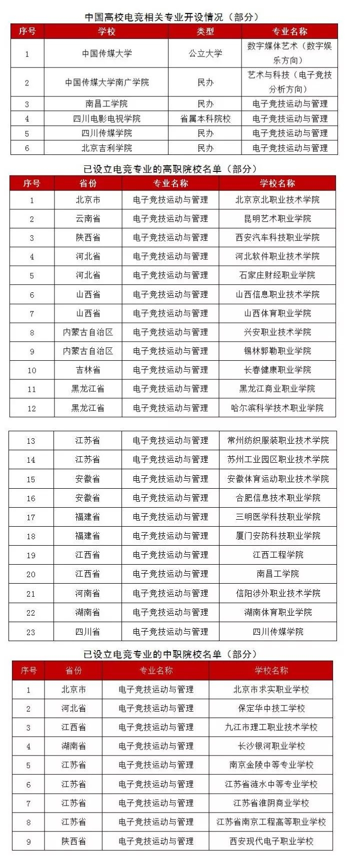 根据人社部的报告,在高校方面,中国传媒大学开设了数字媒体艺术(数字娱乐方向)专业,中国传媒大学南广学院、南昌工学院、四川电影电视学院、四川传媒学院、北京吉利学院等也开设了电竞相关专业。