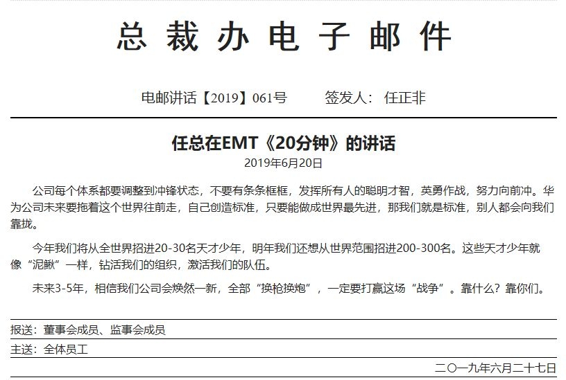 6月27日,华为内部的心声社区挂出任正非6月20日在公司EMT(经营管理团队)《20分钟》的讲话