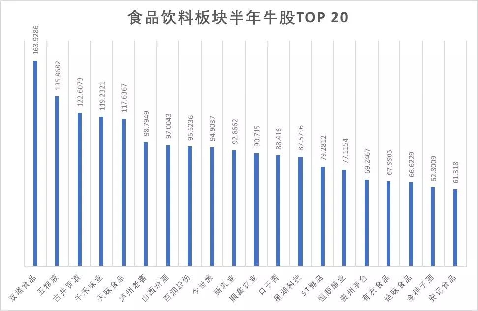 食品饮料板块“第一功臣”称号当仁不让。年初至今,该板块(中信一级)涨幅已经高达60.90%,总市值增加1.36万亿元,特别是白酒和调味品子版块的发力,支撑起食品饮料板块上半年的红火行情。板块牛股多诞生于这两个领域,Wind数据显示,该板块半年股价翻倍的个股有五只,分别为双塔食品、五粮液、古井贡酒、千禾味业、天味食品,均是白酒及调味品龙头股。