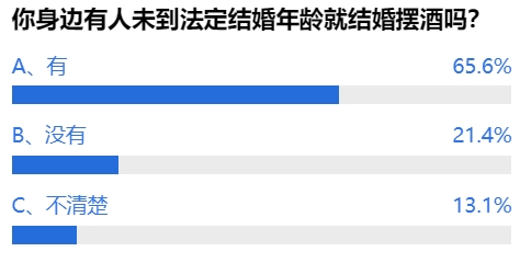 不过,也有支持的网友认为,对于那些已有事实婚姻,但还没有到法定年龄的人来说,降低法定婚龄其实是一种保障,尤其是对早育女性来说。投票结果显示,有超过六成的网友表示身边有人未到法定结婚年龄就摆酒结婚了。