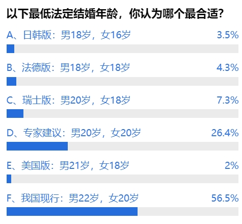 即便如此,超半数(56.5%)网友认为还是我国现行的法定婚龄最合适。而此前有专家建议的男女均为20岁,也有约26.4%的网友认为最合适。而认为其他国家现行法定婚龄合适的网友均不到20%。