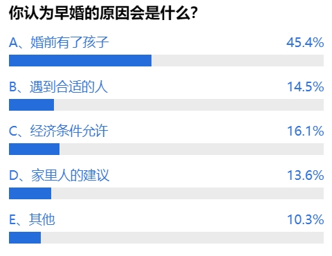 投票结果显示,超4成受访网友认为早婚的主要原因是婚前有了孩子。网友“希。Li”认为,很多“奉子成婚”的年轻人根本没有做好成为父母的思想准备,甚至不具备抚养家庭的经济能力,在婚姻中往往也会摩擦不断。