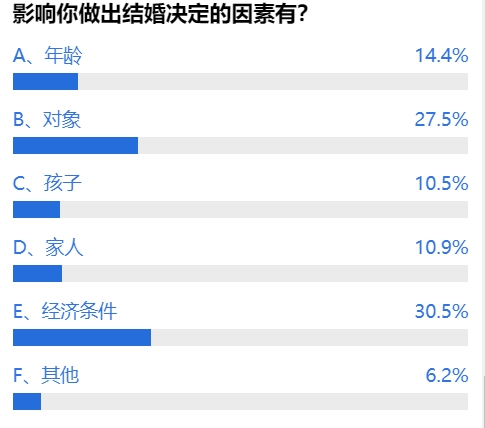不结婚真的不是因为年龄问题!更多的网友认为对象和经济条件才是影响自己做出结婚决定的因素,比例都在30%左右,年龄问题只占约14.4%。
