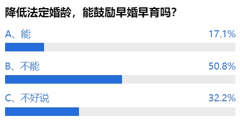至于降低法定婚龄,能不能鼓励早婚早育?过半的受访网友表示不能,也有超过32.2%的网友认为不好说。网友“啊奇诺”就说,不能单靠降低婚龄,还是要配合其他政策的实施吧。