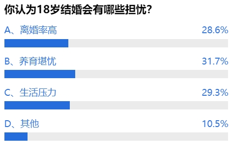 网友们普遍认为18岁就结婚会存在不少担忧,离婚率高、养育堪忧和生活压力三者最为主要。网友“李舒琪”说“18岁,自己都还是个孩子,如何能养育另一个孩子?这不是增加父母的负担,增加社会的闪婚闪离率吗?甚至会增加留守儿童和堕胎率。”网友“球球”也认为如果婚龄降到18岁,离婚率还得涨。