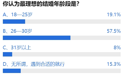 最理想的结婚年龄?投票结果显示,约50%的网友认为是26至30岁,25%的网友认为是18至25岁,也有约20%的网友认为只要遇到合适的人,什么时候结婚都行。实际上,很多人到了理想婚龄却因为种种原因没有结婚,网友“揭玛丽”就担心,法定婚龄降低,岂不是会更早被催婚?