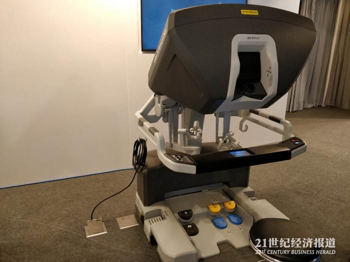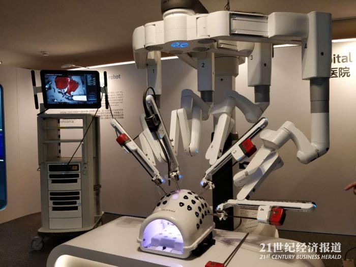 展台负责人向21世纪经济报道记者介绍道,下面这套手术机器人系统名叫“达芬奇”,由三个部分组成——主刀医生控制台、床旁机械臂系统和视频成像系统。“达芬奇”安装在医院手术室,通过医生操控主刀医生控制台对病人完成手术。