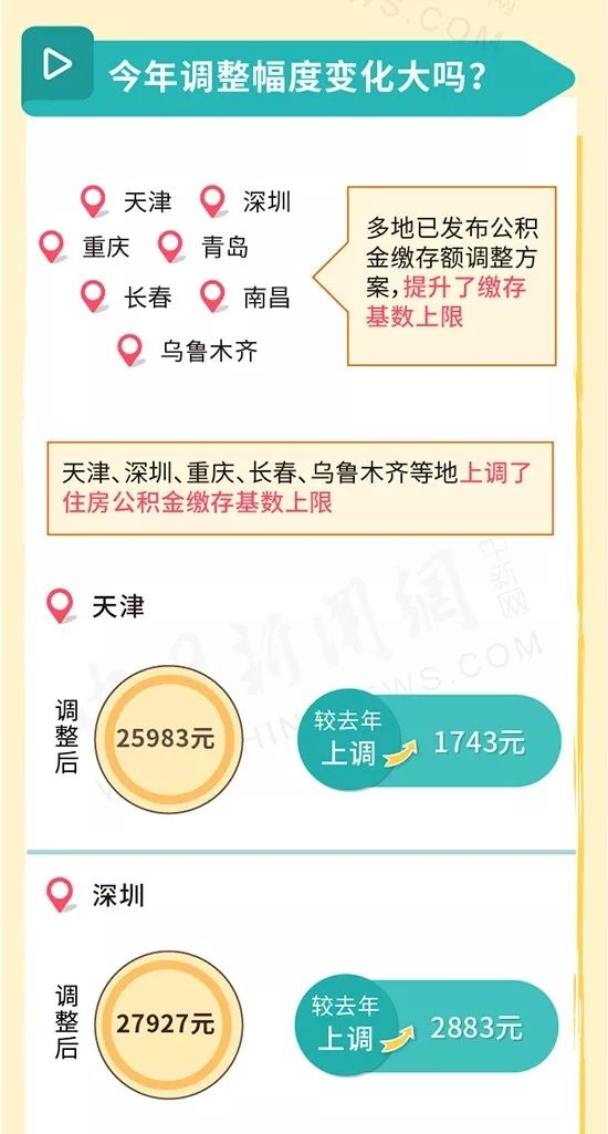 其中,天津调整后的住房公积金缴存基数上限为25983元,较去年上调1743元;深圳调整后的缴存基数上限为27927元,较去年上调2883元;重庆为20441元,较去年上调2123元;长春市(含双阳区、九台区、榆树市、德惠市、农安县)为19730元,较去年上调1696元;乌鲁木齐市为16599元,较去年上调1200元。
