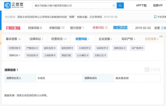 这条推送信息来自于国家企业信用信息公示系统,根据当时的公开报道,国家企业信用信息公示系统的信息中,为“花呗”提供资金支持和平台服务的重庆市蚂蚁小微小额贷款有限公司(即“蚂蚁微贷”)的工商信息中的确出现了清算信息,清算组负责人为车宣呈,清算组成员还有两人分别是胡水清、应君。