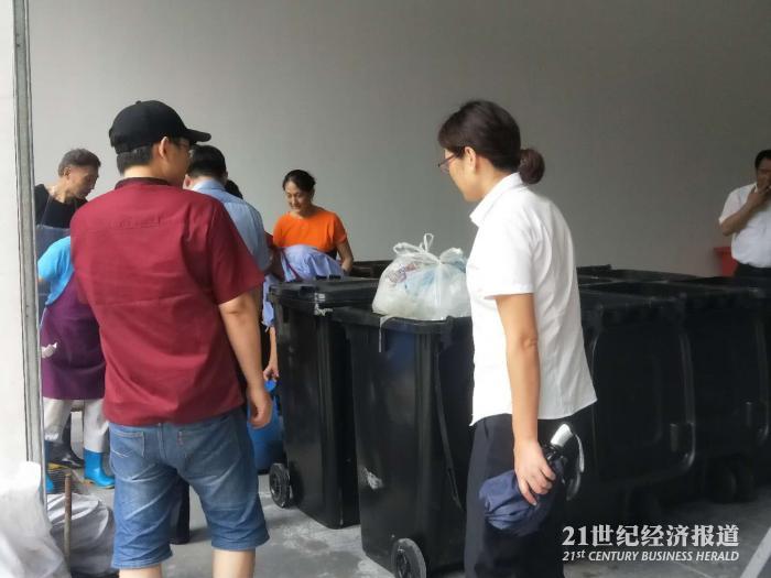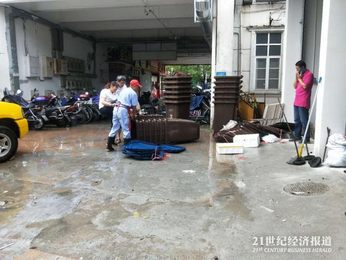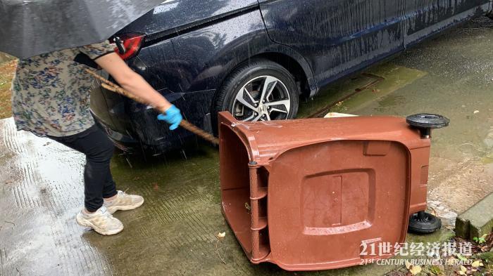 在部分商业区前,一些新领到的是湿垃圾桶也刚刚“到货”,准备发放给附近的商铺,用于专业的餐厨垃圾投放,大雨中几位工作人员正在将垃圾桶进行组装。