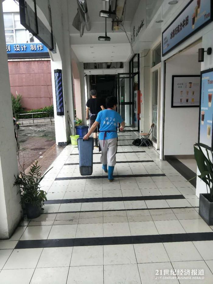 (美食广场的工作人员去倒垃圾,摄影:毕圆梦)