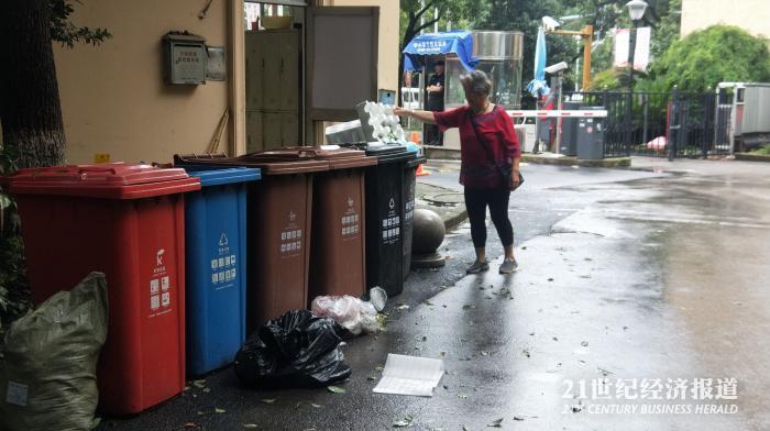 小区内的一位物业工作人员告诉记者,今天一大早他们就在分类投放点值班“看着”居民去倒垃圾,该小区内共有四个垃圾投放点,由于一大早上海下着大雨,新规实施首日的早上,前来投放垃圾的人并不算多。