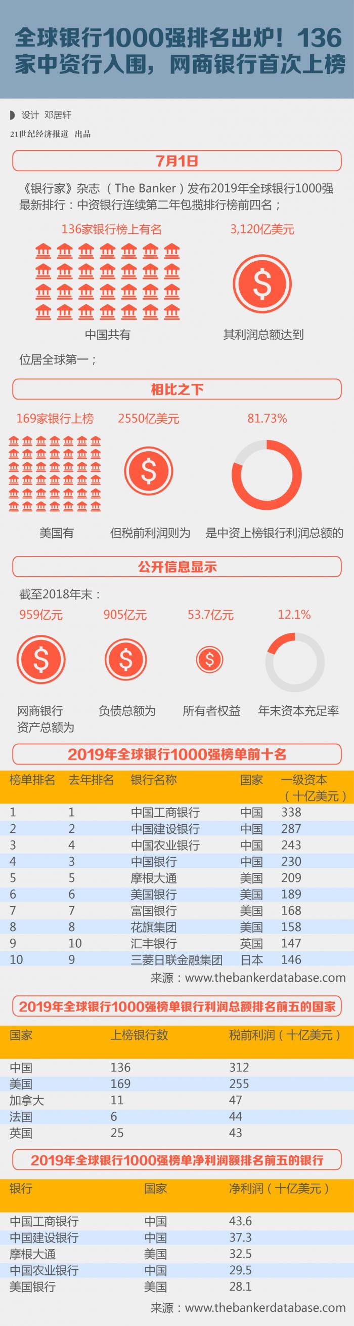 7月1日,《银行家》杂志 (The Banker)发布2019年全球银行1000强最新排行:中资银行连续第二年包揽排行榜前四名;中国共有136家银行榜上有名,其利润总额达到3,120亿美元,位居全球第一;蚂蚁金服旗下网商银行则首次进入该榜单,位列881。