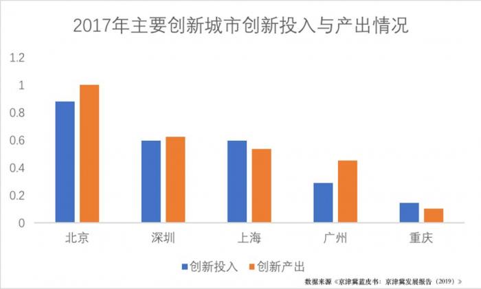 根据2017年的数据显示,北京创新投入得分为0.879,稳居首位,是深圳(0.598)的1.47倍、上海(0.596)的1.48倍、广州(0.287)的3.06倍、重庆(0.143)的6.16倍;