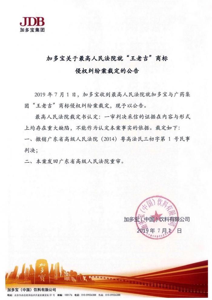 “王老吉”商标侵权纠纷案“大战三百回合”又获最新进展。7月1日晚间,加多宝(中国)饮料有限公司(以下简称“加多宝”)通过自媒体平台发布公告称,2019年7月1日,加多宝收到最高人民法院就加多宝与广药集团“王老吉”商标侵权纠纷案裁定。