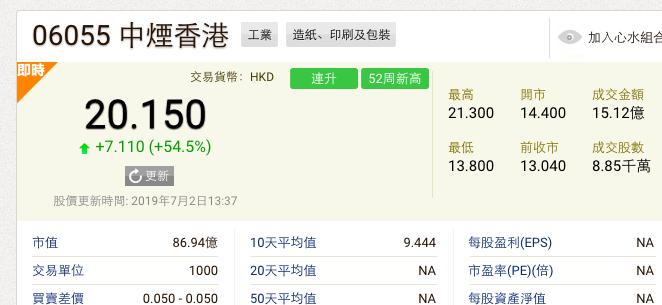 中烟香港﹙6055﹚超额配股权获悉数行使,7月2日,股价再度急升,最新报20.15港元,飙升54.56%,再创上市新高,成交额达15.12亿港元。