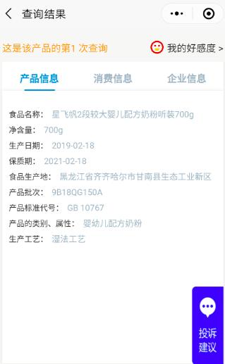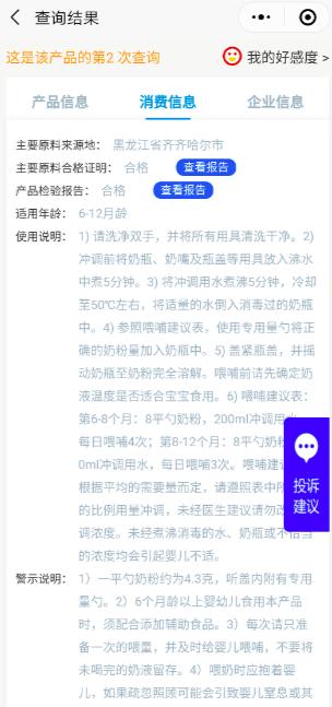 记者随机选择了飞鹤品牌的一款奶粉产品进行了测试发现,通过上述小程序扫描商品二维码之后,可以查询到商品的“产品信息”、”消费信息”和“企业信息”。