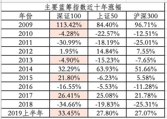 在过去10年,深证100有6年表现好于上证50和沪深300指数。以2017年为例,彼时蓝筹股颇受投资者欢迎,上证50和沪深300等大盘蓝筹指数涨幅均超过20%,但深证100涨幅高达26.4%,超过了同期蓝筹指数的表现。
