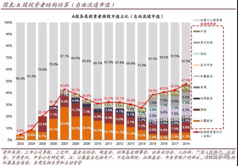 历史上A股散户占比高、市场投机气氛重、有效性弱,但随着A股近年不断开放以及本土机构投资者的发展,A股投资者结构正在逐步国际化、机构化,这也在逐步改变A股的表现特征,值得所有参与者重视。我们综合多方面数据估算来自大股东、基金、保险、外资等各类主要机构投资者及个人投资者在A股市场的持股,结果显示:
