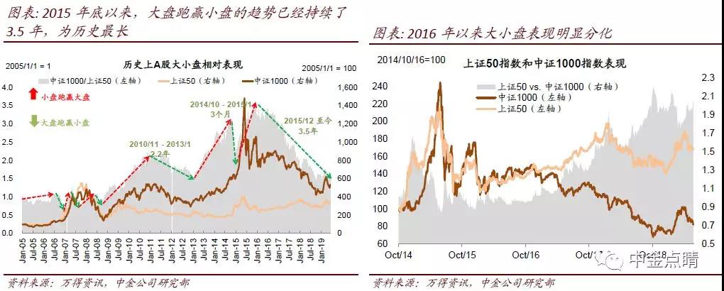 2)大盘蓝筹股长时间持续跑赢:2015年底以来,大盘跑赢小盘的趋势已经持续约3年半,为2005年以来的历史最长记录。