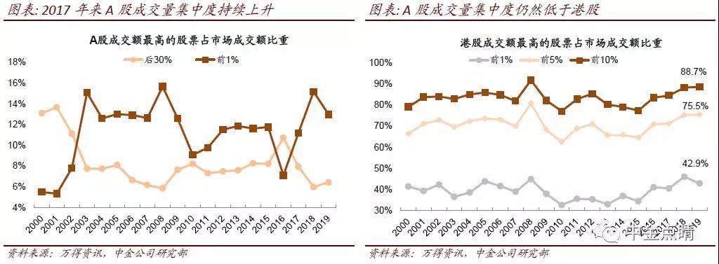 4)成交越来越向“龙头”集中:2018年,成交量前1%的A股合计占到市场成交量的15%,是2009年以来最高;成交量后30%的A股占市场成交的比例是6%,是2009年以来最低。