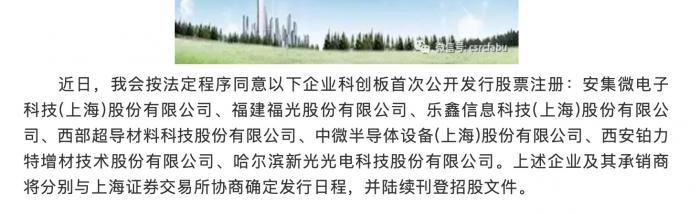 根据7月1日晚公告,证监会同意注册的企业分别有安集科技、福光股份、乐鑫科技、西部超导、中微公司、铂力特、新光光电。