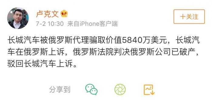 值得注意的是,当天有市场传闻称“长城汽车被俄罗斯代理骗取价值5840万美元,长城汽车在俄罗斯上诉,俄罗斯法院判决俄罗斯公司已破产,驳回长城汽车上诉”。