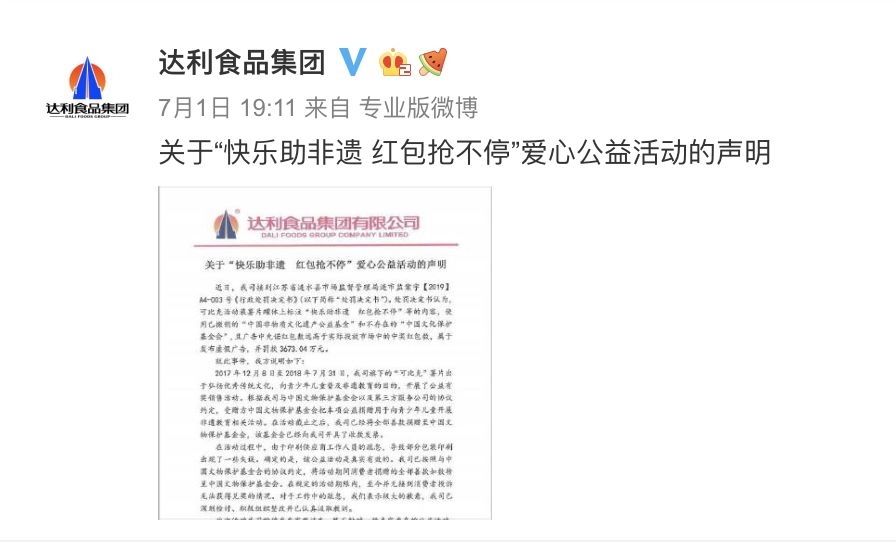 在达利的官方回应中显示,“在活动过程中,由于印刷供应商工作人员的疏忽,导致包装印刷出现了一些失误。但此次公益销售活动是真实有效的。我司已完全、如期地履行协议约定,不存在任何虚假行为,受赠方中国文物保护基金会也按时拿到了善款。”