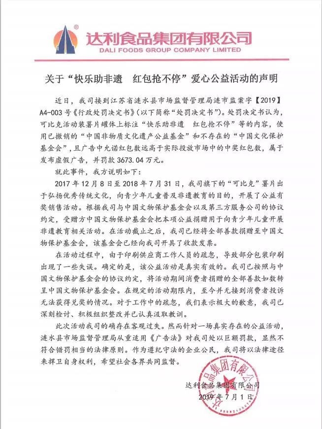 “此次活动我司的确存在客观过失。然而,针对一场真实存在的公益活动,涟水县市场监督管理局从重适用《广告法》对我司处以巨额罚款,显然不符合错罚相当的法律原则。”达利集团表示,“我们将寻求以法律途径来捍卫自身权利。”