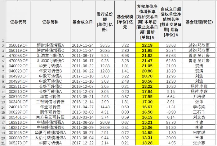 以下是年内收益排名位列前20的转债基金具体收益情况: