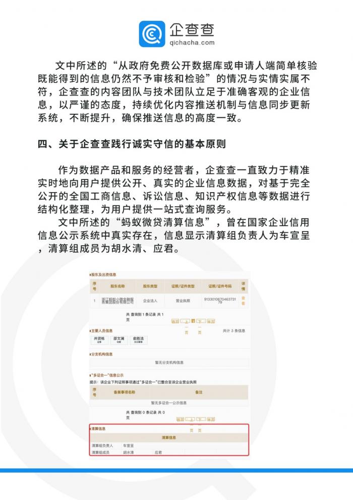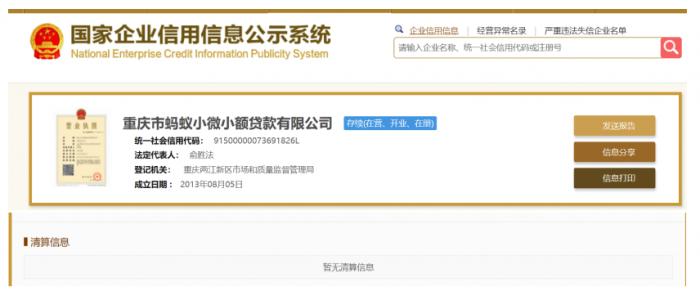 彼时,蚂蚁微贷清算信息确实出现在了国家企业信用信息公示系统里,当时清算组负责人为车宣呈,清算组成员为胡水清和应君。但据了解,上述清算信息为2015年的历史信息。2016年初,蚂蚁金服已向工商部门提交终止清算,继续正常经营。21世纪经济报道记者注意到,目前国家企业信用信息公示信息显示,蚂蚁微贷的状态是存续(在营、开业、在册),为正常经营状态,已经暂无清算信息。