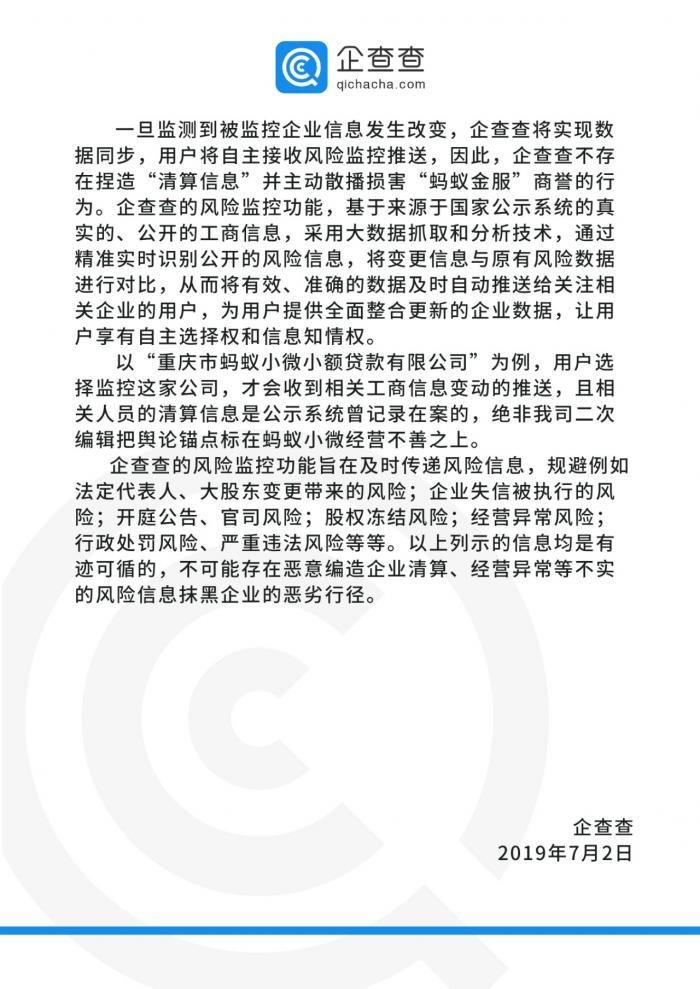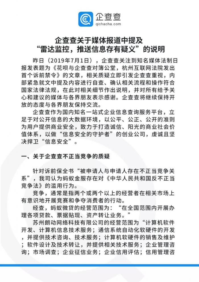 企查查在7月2日发布声明认为,蚂蚁金服存在对《中华人民共和国反不正当竞争法》的滥用行为。