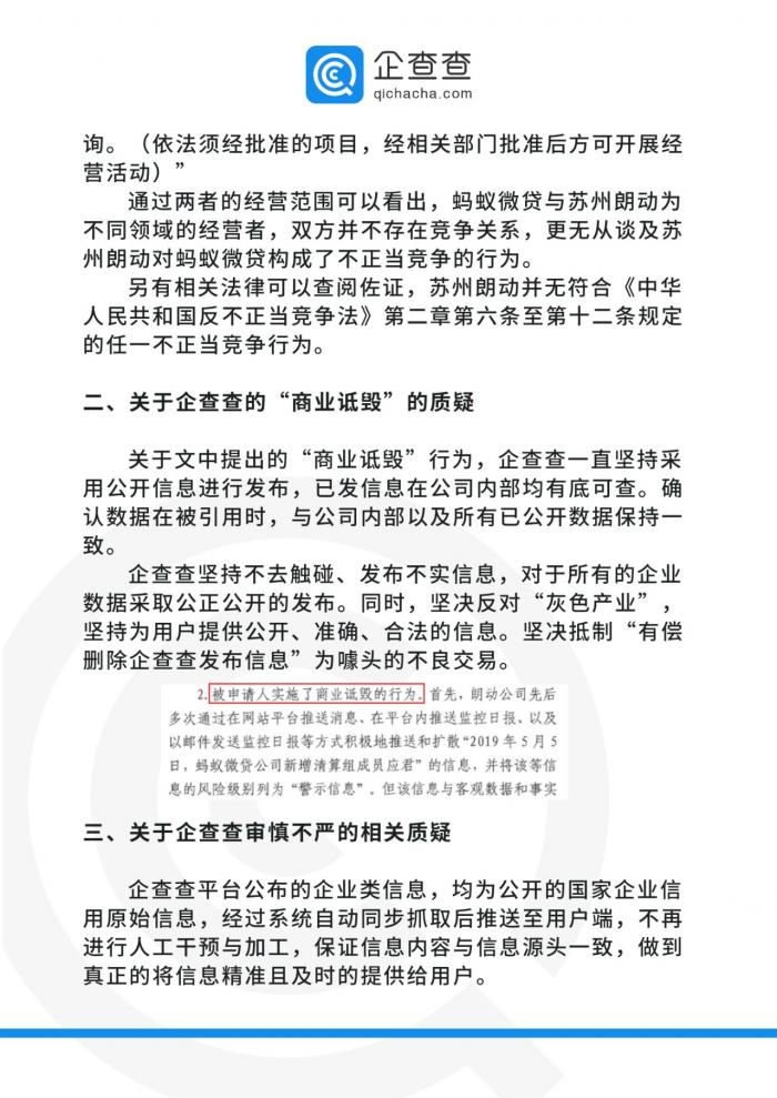 此外,企查查表示平台发布的一切信息均有底可查,不存在“商业诋毁”的行为,也回应了其他媒体关于企查查“审慎不严”的质疑:“企查查平台公布的企业类信息,均为公开的国家企业信用原始信息,经过系统自动同步抓取后推送至用户端,不再进行人工干预,保证信息内容与信息源头一致,做到真正的将信息精准且及时的提供给用户。