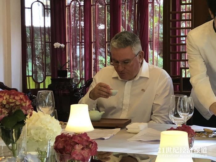 (图注:戴维斯部长在花园酒店品尝粤菜。)