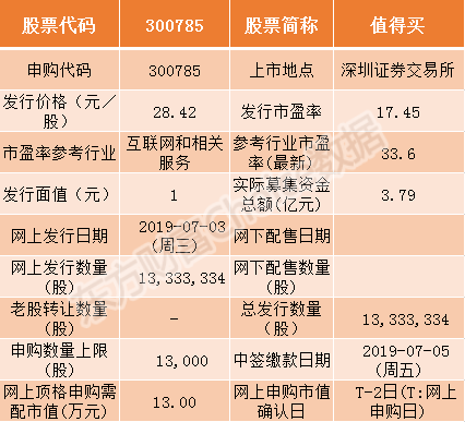 此次发行总数约1333.33万股,网上发行约1333.33万股,发行市盈率17.45倍,申购代码为:300785,申购价格:28.42元,单一帐户申购上限1.3万股,申购数量500股整数倍。