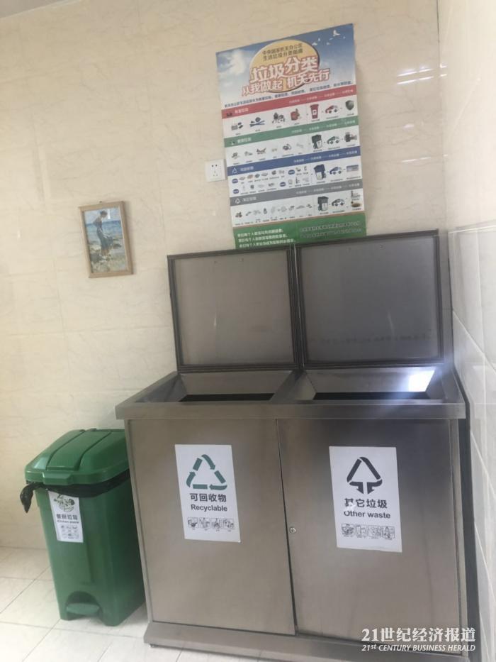 21世纪经济报道记者走访中也还发现,北京的一些机关和事业单位已率先践行垃圾分类。6月26日,记者在西城区某部委看到,从食堂、厕所到办公区域垃圾分类都已经开始,餐毕大家自觉将餐巾纸、酸奶盒、剩饭、餐盘等一一归类,厕所还贴着垃圾分类方法图示大海报。