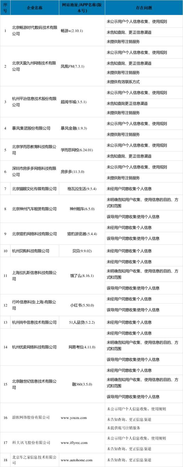 通告显示,一季度,工信部组织对100家互联网企业106项互联网服务进行抽查,发现18家互联网企业存在以下七种问题:未经用户同意收集个人信息;未公示用户个人信息收集、使用规则;未明确告知用户收集、使用信息的目的、方式和范围;未告知查询、更正信息渠道;误导用户同意收集使用个人信息;未提供账号注销服务;未提供有效联系方式。工信部已责令相关企业整改。