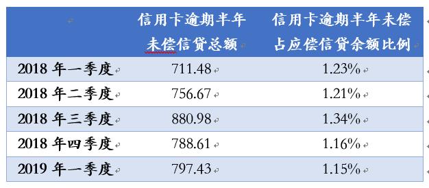 7月3日,根据央行《2019年第一季度支付体系运行总体情况》数据,2019年一季度末,信用卡逾期半年未偿信贷总额797.43亿元,比2018年末增加了8.82亿元;信用卡逾期半年未偿占应偿信贷余额的比例1.15%,占比较上季度末下降0.01个百分点。