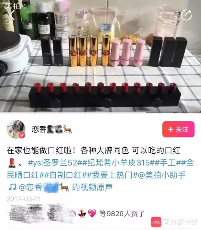 南都记者注意到,一位名为“恋香**”、拥有近5.7万粉丝的美拍用户发布的一则自制口红视频已获得9826人点赞,其宣称“在家也能做口红啦!各种大牌同色,可以吃的口红”,并打上“YSL圣罗兰52”、“纪梵希小羊皮315”等标签,其视频中展示的自制口红亦使用香奈儿等奢侈品外壳。这一山寨行为亦引发部分网友留言质疑,该用户则回应称,使用大牌外壳是“按顾客指定要求定制”,“做的是大牌替代色,不是正品也不按正品的价格卖”。