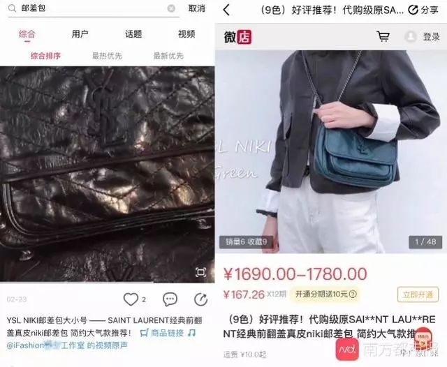 南都记者在美拍搜索“邮差包”,出现一条由“iFashion**工作室”发布的短视频,展示YSL NIKI邮差包,“经典前翻盖真皮,简约大气款推荐!”文字介绍下给出“商品链接”,跳转后可直接进入该用户微店,其产品介绍中赫然写着“代购级原SAI**NT LAU**RENT经典前翻盖真皮邮差包”,“好东西低利润推荐”,该商品售价1690-1780元,不到正品的1/10,还可开通分期付款。南都记者注意到,其所在地显示为广州,目前已售出6个。