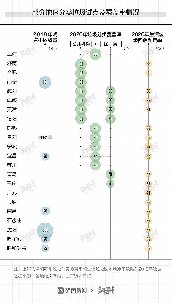 界面数据(公众号ID:shujuxian_kuaikan)进一步分析上述政策后发现,至少15个城市要在2020年完成垃圾分类覆盖率超50%的“小目标”。其中,至少8个城市的公共机构垃圾分类覆盖率要达到80%或更高。