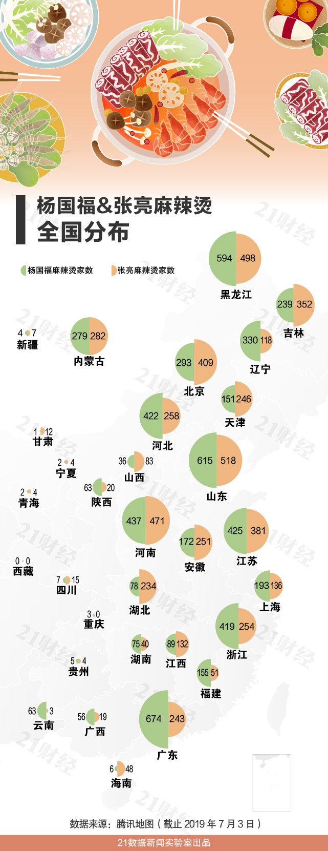 杨国福麻辣烫虽然在黑龙江起家,总部在上海,但却是在广东店面最多,其次分别是山东、黑龙江、河南、江苏。在黑龙江比张亮多出近百家。