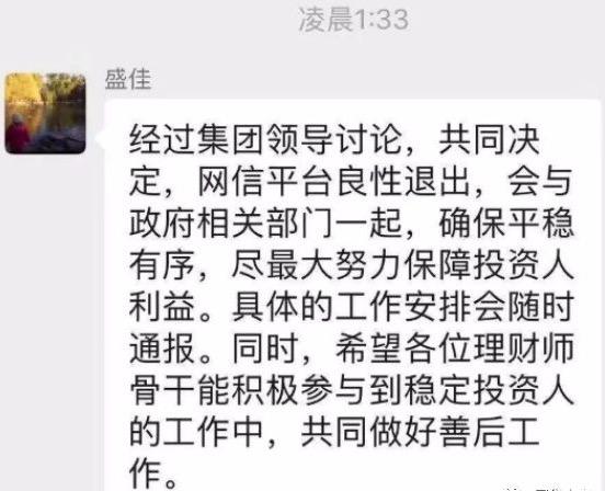 7月4日早上,网传网信平台宣布良性退出,附有网信集团原CEO盛佳发布的微信消息。