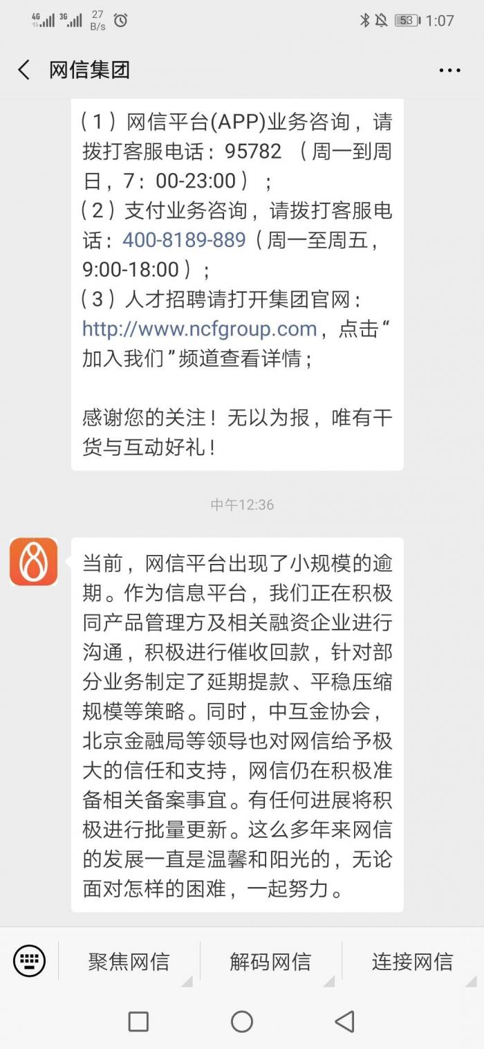 中午,网信集团通过官方公号发布文字信息称,当前,网信平台出现了小规模的逾期。作为信息平台,我们正在积极同产品管理方及相关融资企业进行沟通,积极进行催收回款,针对部分业务制定了延期提款、平稳压缩规模等策略。同时,中互金协会,北京金融局等领导也对网信给予极大的信任和支持,网信仍在积极准备相关备案事宜。有任何进展将积极进行批量更新。