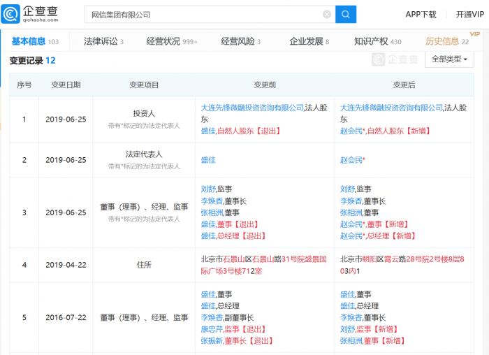 企查查显示,6月25日,网信集团有限公司自然人股东、法定代表人和高管发生变更,自然人股东(持股1%)、法定代表人、总经理均由盛佳变更为赵会民。