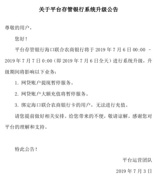7月3日,网信普惠发布关于平台存管银行系统升级公告,平台存管银行海口联合农商银行将于2019 年7 月6 日00:00 –2019年7月7日0:00(即2019年7月6日全天)进行系统升级,升级期间将影响以下业务: