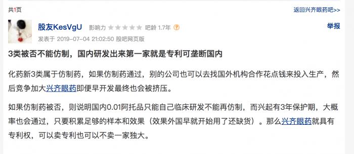 有股吧投资者指出,“兴齐药业被否的化药新3类属于仿制药,如果仿制药通过,别的公司也可以去找国外机构合作花点钱来投入生产,然后竞争加大兴齐眼药即便早开发最终也会被挤压。”