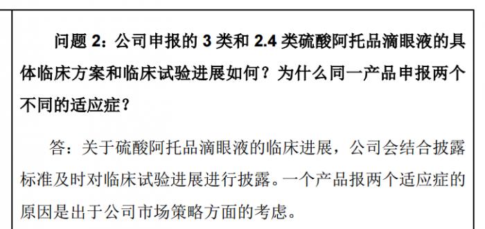今年1月,曾有投资者在调研时提问兴齐药业管理层“公司申报的3类和2.4类硫酸阿托品滴眼液的具体临床方案和临床试验进展如何?为什么同一产品申报两个不同的适应症?”