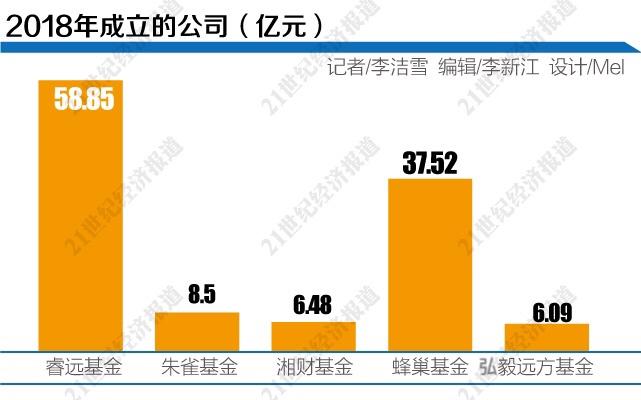 除睿远外,2018年成立的已经发行公募产品的还有4家公司,分别是朱雀基金、湘财基金、蜂巢基金和弘毅远方基金,这4家公司年中非货基规模依次是8.5亿元、6.48亿元、37.52亿元和6.09亿元,对应的行业排名分别是第118名、第121名、第94名和第123名。